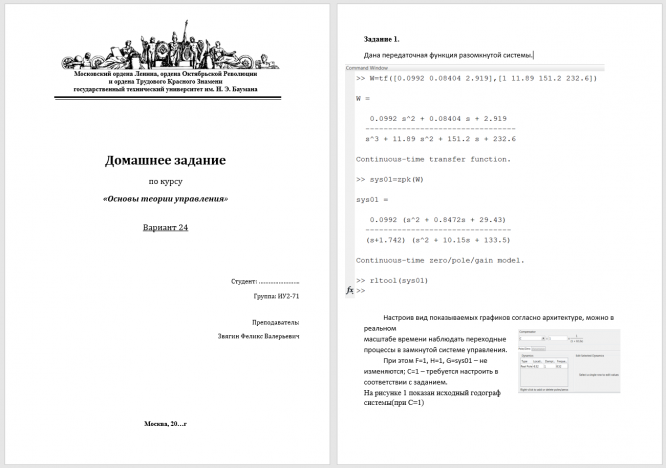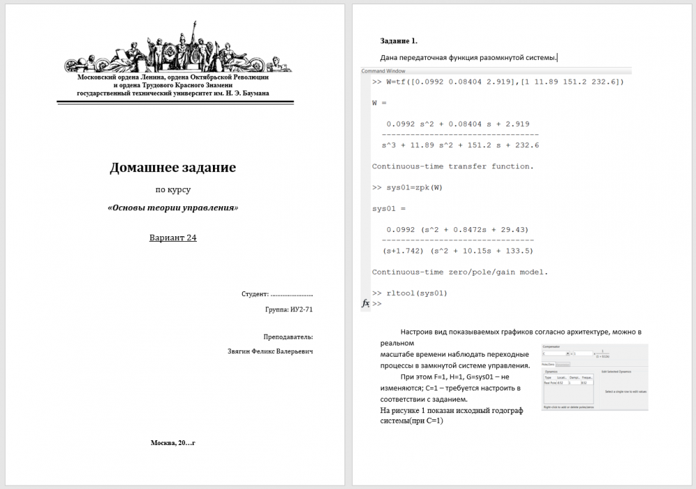 Линейные (линеаризованные) системы: 1. Требуется провести анализ замкнутой системы на устойчивость, получить переходный процесс при поданном ступенчатом входном воздействии и определить диапазон коэффициентов усиления, в котором система является устойчивой. 2. Используя технику корневого годографа построить астатическую систему первого порядка с перерегулированием не выше 20%, изменяя положение нулей и полюсов корректирующего устройства. Переходная функция за время переходного процесса может совершить не более 3 колебаний. Нелинейные системы: 3. Для заданной 2-х мерной нелинейной системы д.у. построить фазовый портрет, на котором указать положение особых (неподвижных) точек, исчерпывающее количество фазовых траекторий, демонстрирующих различную динамику изображающей точки, предельные циклы и т.п.