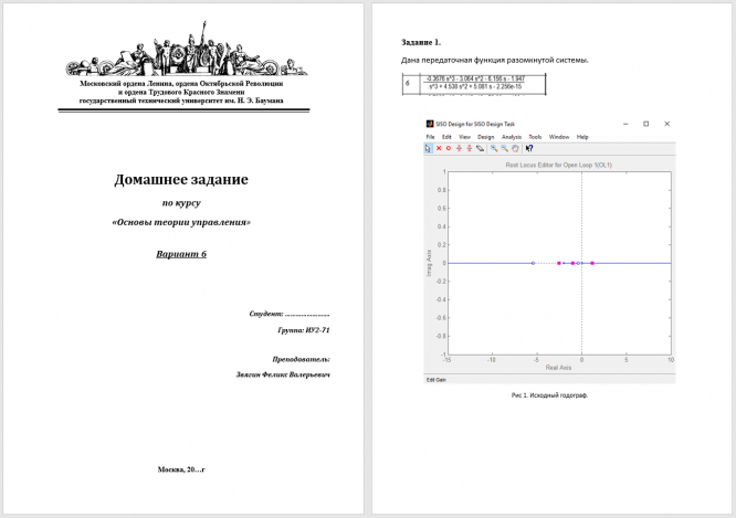 Линейные (линеаризованные) системы: 1. Требуется провести анализ замкнутой системы на устойчивость, получить переходный процесс при поданном ступенчатом входном воздействии и определить диапазон коэффициентов усиления, в котором система является устойчивой. 2. Используя технику корневого годографа построить астатическую систему первого порядка с перерегулированием не выше 20%, изменяя положение нулей и полюсов корректирующего устройства. Переходная функция за время переходного процесса может совершить не более 3 колебаний. Нелинейные системы: 3. Для заданной 2-х мерной нелинейной системы д.у. построить фазовый портрет, на котором указать положение особых (неподвижных) точек, исчерпывающее количество фазовых траекторий, демонстрирующих различную динамику изображающей точки, предельные циклы и т.п.