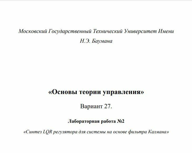 Для студентов МГТУ им. Н.Э.Баумана по предмету Основы теории управления (ОТУ)Вариант 27 - Отчет по ЛР №2 - Синтез LQR регулятора для системы на основе фильтра КалманаВариант 27 - Отчет по ЛР №2 - Синтез LQR регулятора для системы на основе фильтра Калмана