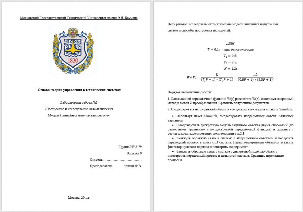Для студентов МГТУ им. Н.Э.Баумана по предмету Основы теории управления (ОТУ)Построение и исследование математических моделей линейных импульсных системПостроение и исследование математических моделей линейных импульсных систем
