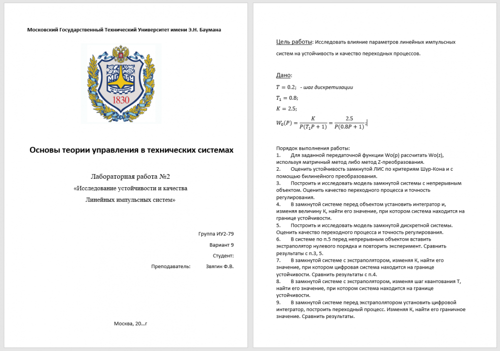 Для студентов МГТУ им. Н.Э.Баумана по предмету Основы теории управления (ОТУ)Исследование устойчивости и качества линейных импульсных системИсследование устойчивости и качества линейных импульсных систем