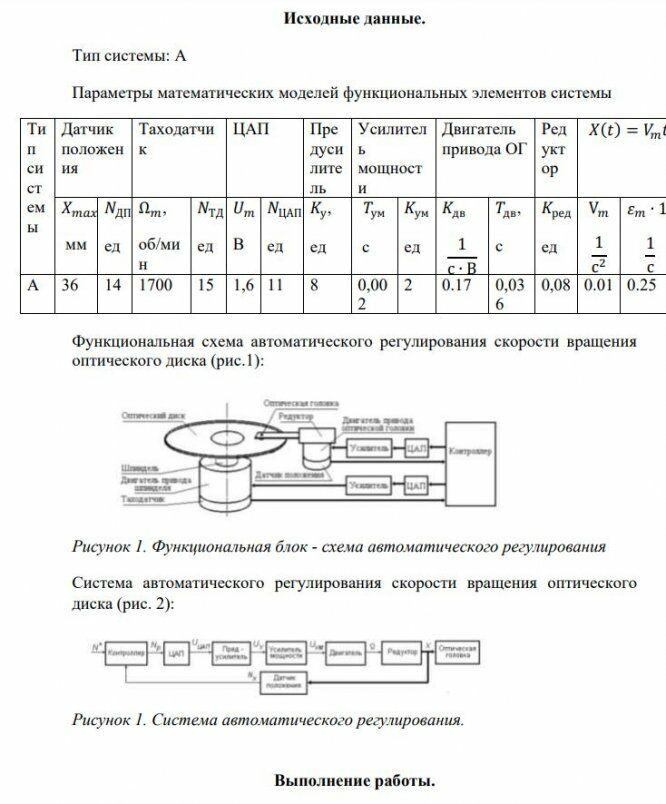 Первая часть выполнения научно – исследовательской работы основывается на динамическом расчете контура управления и стабилизации угловой скорости шпинделя оптического диска контура автоматического позиционирования ОГ. В ходе выполнения данного анализа необходимо сформировать функциональную блок-схему системы автоматического регулирования позиционирования оптической головки , и, пренебрегая нелинейностями характеристик функциональных элементов системы и дискретным характером процессов в отдельных точках системы, сформировать линейные модели элементов ее неизменяемой части и вычислить числовые значения параметров этих модулей с учетом требуемых условий. Также необходимо определить передаточные функции элементов системы и составить структурную схему системы с учетом управляющего воздействия. Исходную структурную схему преобразуем к эквивалентной с единичной обратной связью методом структурных преобразований. Определим передаточные функции разомкнутой, замкнутой системы и передаточную функцию ошибки по управляющему воздействию. По полученным передаточным функциям необходимо построить дифференциальные уравнения системы и получить выражения характеристических полиномов для системы в разомкнутом и замкнутом состояниях. Проанализировать также устойчивость неизменяемой системы, используя алгебраический критерий Гурвица и частотный критерий Найквиста. Также определим показатели динамического качества и статической точности по реакциям системы на тестовые ступенчатое и линейно возрастающее входное воздействие