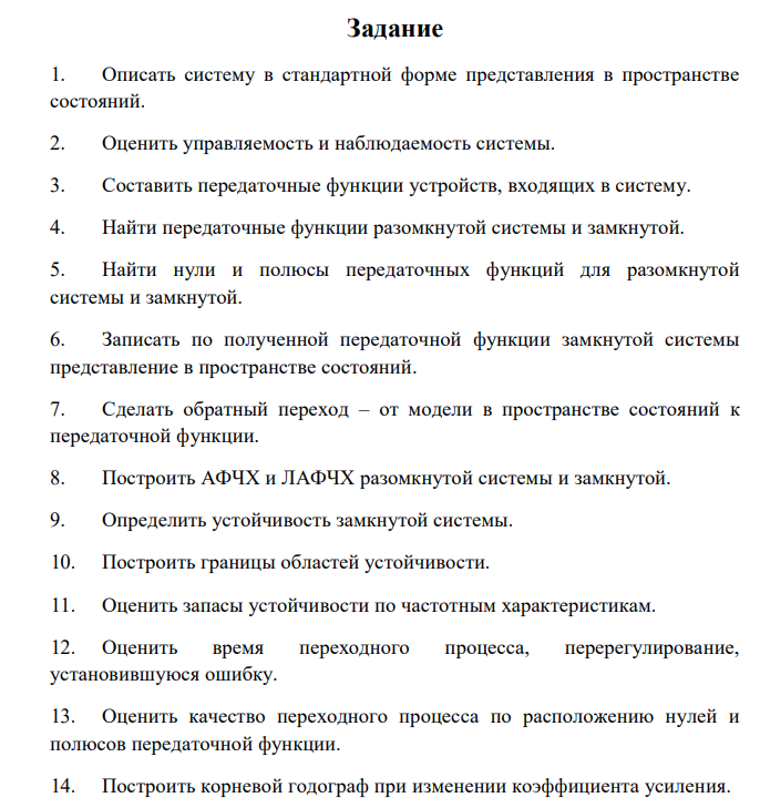 1. Описать систему в стандартной форме представления в пространстве состояний. 2. Оценить управляемость и наблюдаемость системы. 3. Составить передаточные функции устройств, входящих в систему. 4. Найти передаточные функции разомкнутой системы и замкнутой. 5. Найти нули и полюсы передаточных функций для разомкнутой системы и замкнутой. 6. Записать по полученной передаточной функции замкнутой системы представление в пространстве состояний. 7. Сделать обратный переход – от модели в пространстве состояний к передаточной функции. 8. Построить АФЧХ и ЛАФЧХ разомкнутой системы и замкнутой. 9. Определить устойчивость замкнутой системы. 10. Построить границы областей устойчивости. 11. Оценить запасы устойчивости по частотным характеристикам. 12. Оценить время переходного процесса, перерегулирование, установившуюся ошибку. 13. Оценить качество переходного процесса по расположению нулей и полюсов передаточной функции. 14. Построить корневой годограф при изменении коэффициента усиления.