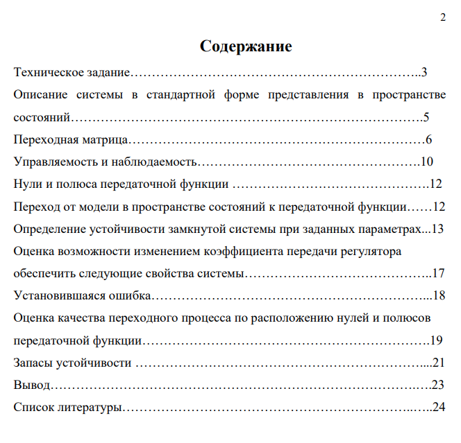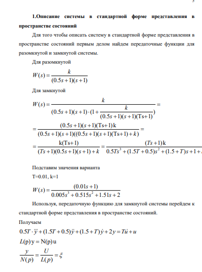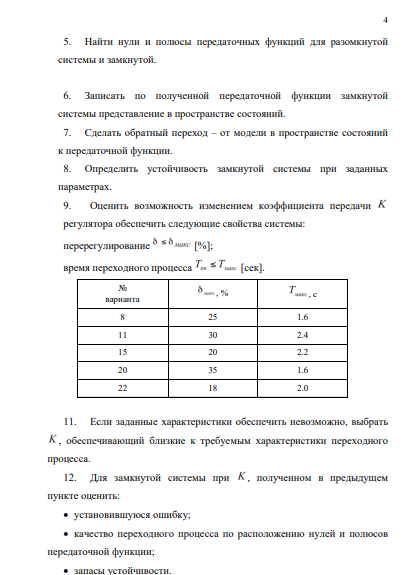 З 1. Описать систему в стандартной форме представления в пространстве состояний 2. Найти переходную матрицу. 3. Оценить управляемость и наблюдаемость системы. 4. Найти передаточные функции разомкнутой системы и замкнутой. 4 5. Найти нули и полюсы передаточных функций для разомкнутой системы и замкнутой. 6. Записать по полученной передаточной функции замкнутой системы представление в пространстве состояний. 7. Сделать обратный переход – от модели в пространстве состояний к передаточной функции. 8. Определить устойчивость замкнутой системы при заданных параметрах. 9. Оценить возможность изменением коэффициента передачи регулятора обеспечить следующие свойства системы: перерегулирование [%]; время переходного процесса [сек]