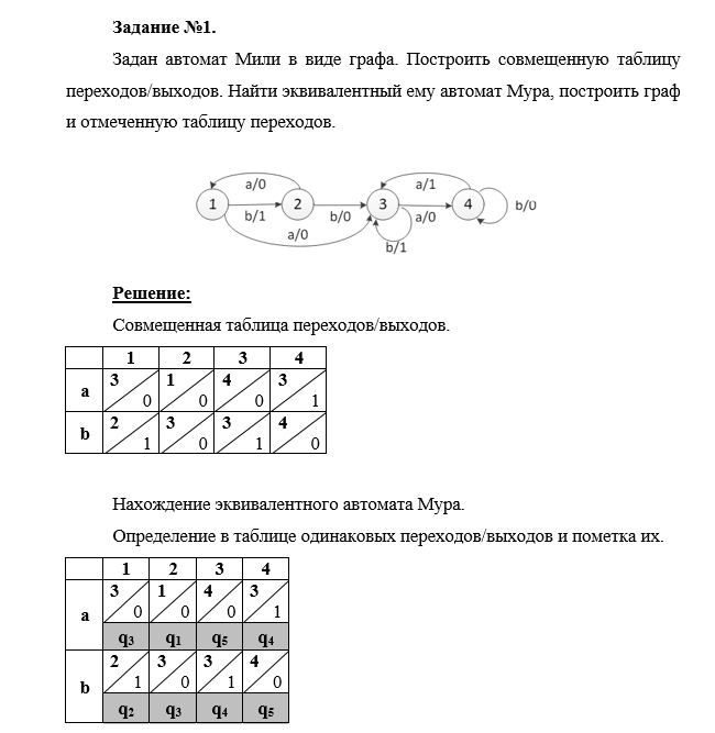 1) Задан автомат Мили в виде графа. Построить совмещенную таблицу переходов/выходов. Найти эквивалентный ему автомат Мура, построить граф и отмеченную таблицу переходов.