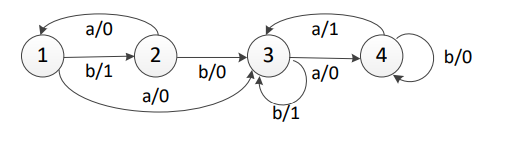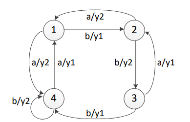 1. Задан автомат Мили в виде графа. Построить совмещенную таблицу переходов/выходов. Найти эквивалентный ему автомат Мура, построить граф и отмеченную таблицу переходов.