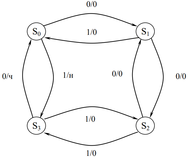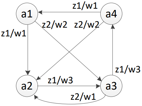 1 Задание: задан автомат Мили в виде графа. Построить совмещенную таблицу переходов/выходов. Найти эквивалентный ему автомат Мура, построить граф и отмеченную таблицу переходов.
