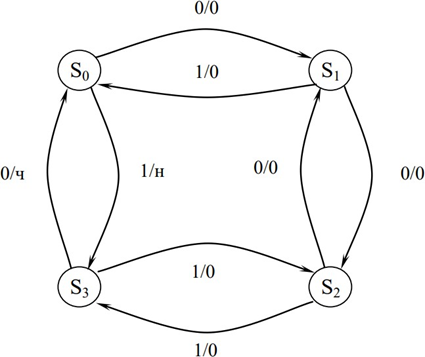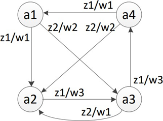 Задание 1: задан автомат Мили в виде графа. Построить совмещенную таблицу переходов/выходов. Найти эквивалентный ему автомат Мура, построить граф и отмеченную таблицу переходов.
