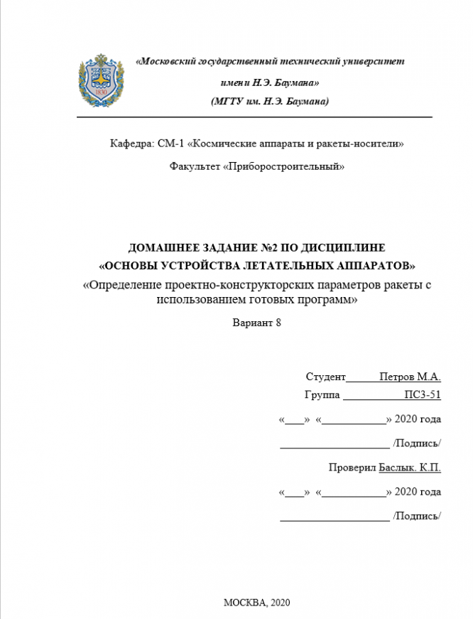 Для студентов МГТУ им. Н.Э.Баумана по предмету Основы устройства космических аппаратов (ОУКА)Вариант 8 Домашнее задание №2 "Определение проектно-конструкторский параметров ракеты с использованием готовых программ" DWG + РПЗ в WORDВариант 8 Домашнее задание №2 "Определение проектно-конструкторский параметров ракеты с использованием готовых программ" DWG + РПЗ в WORD