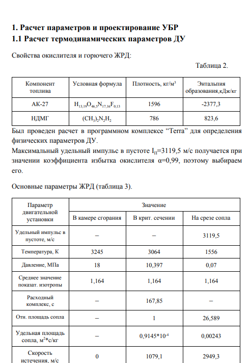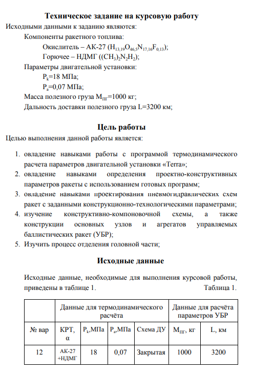 Исходными данными к заданию являются: Компоненты ракетного топлива: Окислитель – АК-27 (H13,19O46,5N17,16F0,13); Горючее – НДМГ ((CH3)2N2H2); Параметры двигательной установки: Pk=18 МПа; Pa=0,07 МПа; Масса полезного груза МПГ=1000 кг; Дальность доставки полезного груза L=3200 км;