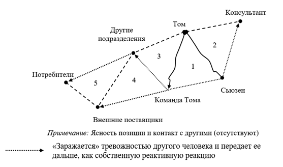 Реактивность одного из участников триагуляционных отношений часто приводить к тому, что в них, постепенно, вовлекается многих людей (родственников, друзей, сотрудников, партнеров по бизнесу и т.д.). Это создает массу новых треугольников с целью избавления от тревожности. Реактивность каскадом обрушивается на всю систему просьбами поручениями, новыми требованиями, сплетнями, секретами (замалчиванием информации) и т.п. Эти реакции истощаю креативные ресурсы системы, необходимые ей для решения проблемы.