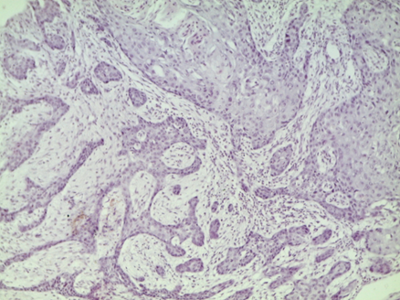 Пласты и тяжи атипичного плоского эпителия врастают в подлежащую соединительную ткань и в мышечную оболочку пищевода. В центре пластов происходит ороговение эпителия – образуются так называемые «раковые жемчужины». В строме опухоли инфильтрация преимущественно лейкоцитами и плазматическими клетками. Обратить внимание, что в имеющихся в препарате небольших лимфоузлах метастазов еще нет.