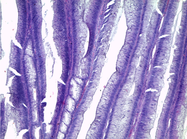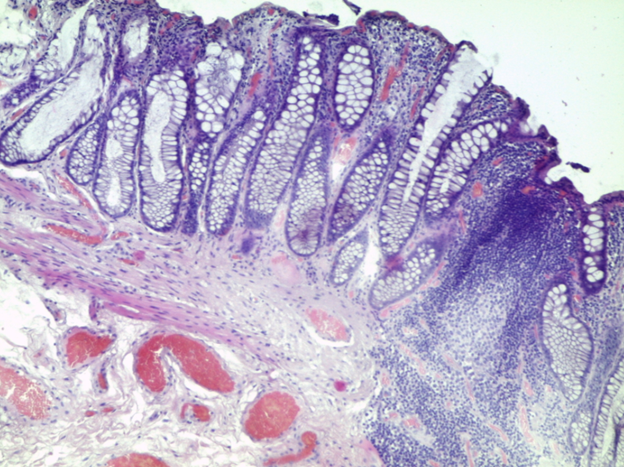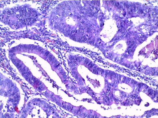Полиповидное опухолевое образование толстого кишечника из пролиферирующего железистого эпителия с признаками дисплазии, покрывающего ворсинчатые выросты – аденома. В опухоли определяются очаги инвазивной внутрислизистой аденокарциномы в виде плохо сформированных сливающихся железистых комплексов из атипичного эпителия. В крае препарата сохранена нормальная слизистая толстой кишки.