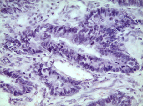 В одной части препарата обнаруживаем нормальное строение слизистой оболочки. На большем протяжении слизистая представлена опухолевой тканью, паренхима ее состоит из причудливых ветвящихся железистых трубочек, эпителий которых полиморфный; ядра крупные, сочные, гиперхромные с множеством митозов. Такие же железистые образования видны в подслизистом и мышечном слоях стенки. В строме опухоли воспалительные инфильтраты, очаговые кровоизлияния.