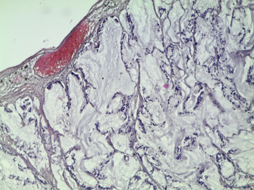 В ткани легкого – опухолевый узел слизеобразующей (муцинозной) аденокарциномы.
