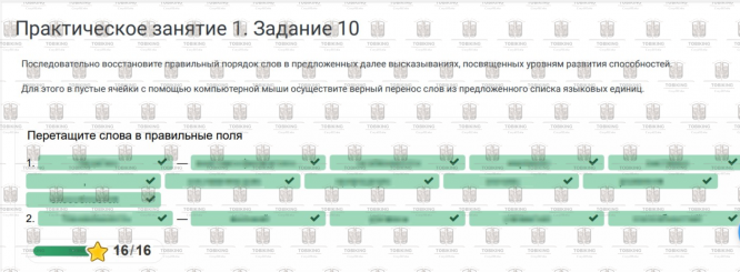 Практическое занятие 1. Задание 10 Последовательно восстановите правильный порядок слов в предложенных далее высказываниях, посвященных уровням развития способностей. Для этого в пустые ячейки с помощью компьютерной мыши осуществите верный перенос слов из предложенного списка языковых единиц. .
