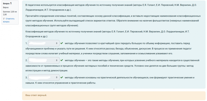 Прочитайте определения ключевых понятий, составляющих основу данной классификации, и вставьте недостающие наименования классификационных групп методов обучения. Используйте выпадающий список вариантов ответов. Обратите внимание на наличие фальшответов (неверных наименований классификационных групп методов обучения).