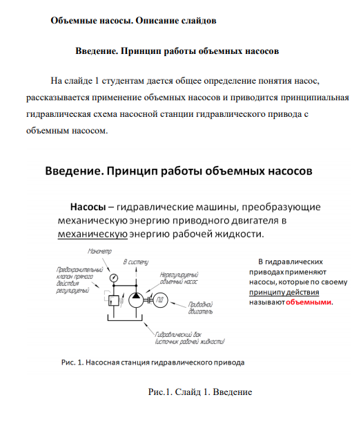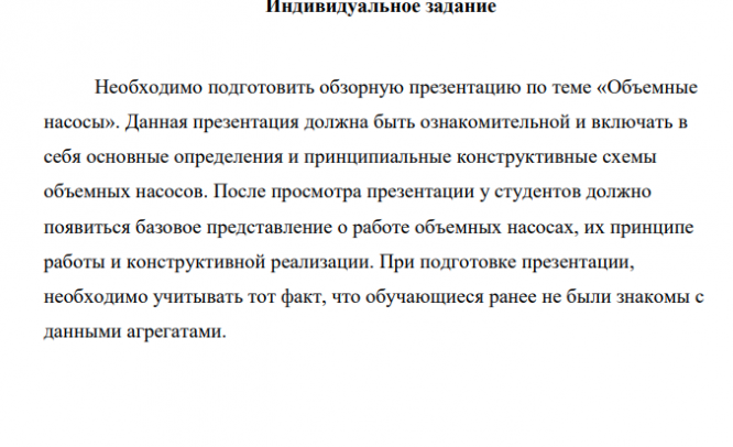 Необходимо подготовить обзорную презентацию по теме «Объемные насосы». Данная презентация должна быть ознакомительной и включать в себя основные определения и принципиальные конструктивные схемы объемных насосов. После просмотра презентации у студентов должно появиться базовое представление о работе объемных насосах, их принципе работы и конструктивной реализации. При подготовке презентации, необходимо учитывать тот факт, что обучающиеся ранее не были знакомы с данными агрегатами.