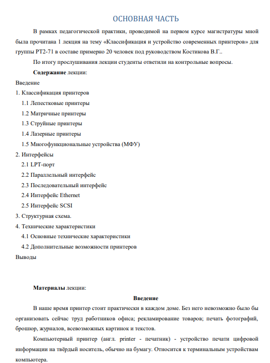 В рамках педагогической практики, проводимой на первом курсе магистратуры мной была прочитана 1 лекция на тему «Классификация и устройство современных принтеров» для группы РТ2-71 в составе примерно 20 человек под руководством Костикова В.Г.. По итогу прослушивания лекции студенты ответили на контрольные вопросы.