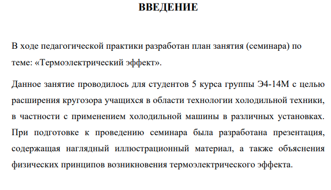 В ходе педагогической практики разработан план занятия (семинара) по теме: «Термоэлектрический эффект». Данное занятие проводилось для студентов 5 курса группы Э4-14М с целью расширения кругозора учащихся в области технологии холодильной техники, в частности с применением холодильной машины в различных установках. При подготовке к проведению семинара была разработана презентация, содержащая наглядный иллюстрационный материал, а также объяснения физических принципов возникновения термоэлектрического эффекта.