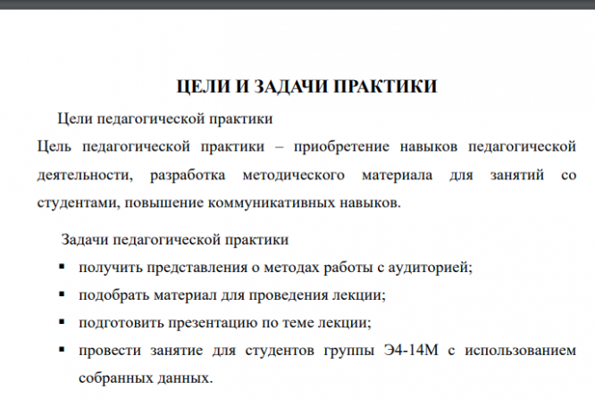 Цель педагогической практики – приобретение навыков педагогической деятельности, разработка методического материала для занятий со студентами, повышение коммуникативных навыков.