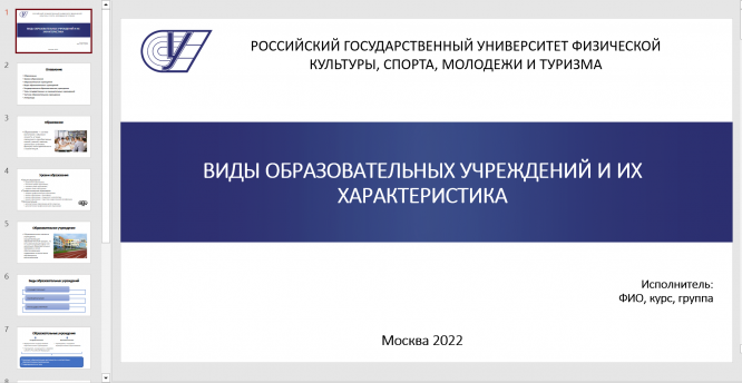 Презентация по Педагогике на тему "Виды образовательных учреждений и их характеристика". Объем работы - 10 слайдов.