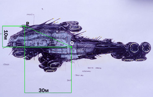 На представленном ниже рисунке изображен корабль и буквой P отмечена безвременно ушедшая башня. Из документации известно, что стандартная пушка, устанавливаемая на боевые корабли, весит 4 тонны. Навуходоносор весит 300 тонн. При настройке рулей корабля центр тяжести корабля устанавливается, как показано на рисунке – точка О. При оптимизации устойчивости корабельного орудия, было выставлено показанное на чертеже положение орудия (точка P – центр тяжести орудия). Найдите положение центра масс корабля после потери пушки.