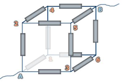 Задача. Найти сопротивление участка цепи AB, изображенного на рисунке. Все резисторы имеют одинаковые сопротивления r и расположены по ребрам куба.