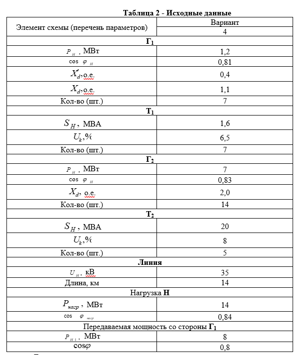 Для всех вариантов определить предел передаваемой мощности со стороны станции с генераторами Г1. Место подключения нагрузки в схеме электропередачи, характер ее представления определяются по варианту. Варианты задания 1 представлены в таблице 1 и 2