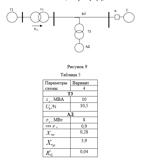 Для электропередачи, преобразованной в соответствии со схемой задания 2 (оставлены без изменения элементы передающей станции, место подключения нагрузки, система принята обладающей неограниченной мощностью, нагрузка представлена в виде эквивалентного асинхронного двигателя, присоединенного к шинам вторичного напряжения п/ст) определить в соответствии с вариантом задания:
