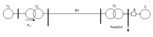 Для электропередачи, преобразованной в соответствии со схемой задания 1 (оставлены без изменения элементы передающей станции; место подключения нагрузки, приемная система представлена нагрузкой и системой неограниченной мощности; нагрузка задана статическими характеристиками проверить статическую устойчивость нагрузки по критериям и , полагая, что выключатель В отключен (см.пример 2 [1]). На генераторах АРВ отсутствует.