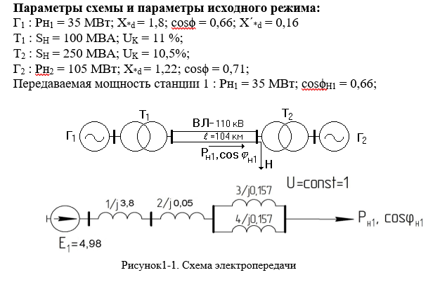 На рисунке 1-1 приведена схема электрической системы, содержащая две генераторные станции, питающие комплексную нагрузку. Требуется:1) определить коэффициент запаса статической устойчивости по идеальному пределу мощности;