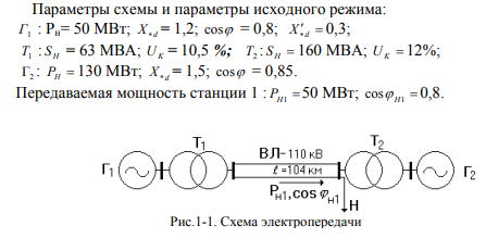 Практическое занятие № 1 Тема: «Угловые характеристики одномашинной системы, работающей на шины бесконечной мощности. Статическая устойчивость нерегулируемой системы при нагрузке, заданной постоянным сопротивлением или статическими характеристиками» Задача 1-1. На рис. 1-1 приведена схема электрической системы, содержащая две генераторные станции, питающие комплексную нагрузку. Требуется: 1) определить коэффициент запаса статической устойчивости по идеальному пределу мощности; 2) построить угловую характеристику активной мощности передающей станции и определить коэффициент запаса статической устойчивости по действительному пределу мощности, представив нагрузку постоянным комплексным сопротивлением; 3) определить коэффициент запаса статической устойчивости по действительному пределу мощности, представив нагрузку статическими характеристиками.