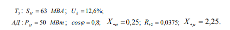 Задача 2-2. Схема системы аналогична схеме задачи 2-1. Исходный режим и параметры элементов системы полностью повторяют данные задачи 2-1. Исключение составляет нагрузка, которая представлена в виде эквивалентного асинхронного двигателя АД (рис. 2-7). Параметры новых элементов расчетной схемы: