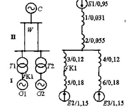 3. Используя расчетную схему и указанные там исходные данные (вычисленные при базисных условиях Sб = 125 МВ·А; UбI = 10 кВ; UбII = UбI(1/nI) = 10·(1/(10,5/254)) = 242 кВ; IбI = 7,2кА); , вычислить ударный ток КЗ в расчетной точке К1 и апериодическую составляющую тока КЗ в момент времени τ = 0,1 с.