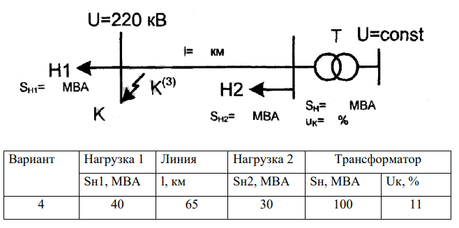 Задача: Рассчитать установившийся ток трехфазного КЗ в точке К системы.