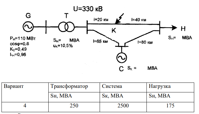 Для студентов по предмету Переходные процессыДля схемы сети определить установившийся ток трехфазного КЗ в точке КДля схемы сети определить установившийся ток трехфазного КЗ в точке К