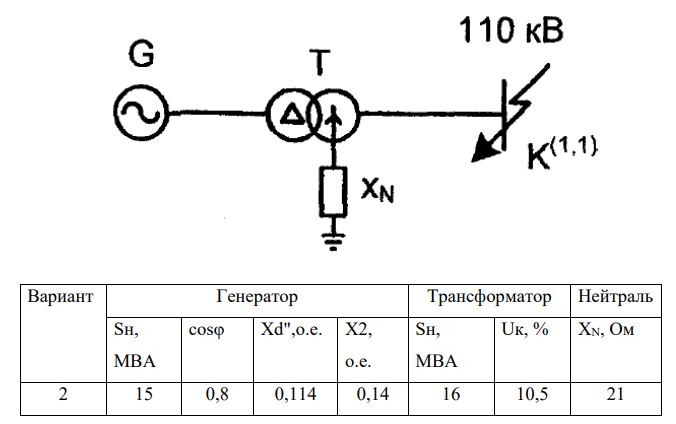 Задача: Определить ток двухфазного КЗ на землю и ток в нейтрали трансформатора для схемы: