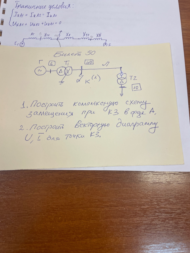Задача: 1. Построить комплексную схему замещения при КЗ в фазе "А" 2. Построить векторную диаграмму U, I для точки КЗ. вариант 50
