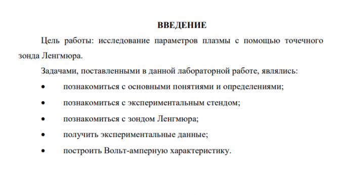 Цель работы: исследование параметров плазмы с помощью точечного зонда Ленгмюра. Задачами, поставленными в данной лабораторной работе, являлись: познакомиться с основными понятиями и определениями; познакомиться с экспериментальным стендом; познакомиться с зондом Ленгмюра; получить экспериментальные данные; построить Вольт-амперную характеристику.