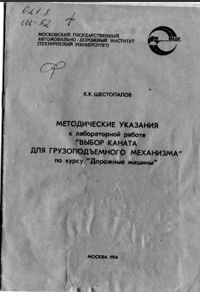 Для студентов МГТУ им. Н.Э.Баумана по предмету Подъёмно-транспортные машины (ПТМ)К.К. Шестопалов - Методические указания к лабораторной работе "Выбор каната для грузоподъемного механизма"К.К. Шестопалов - Методические указания к лабораторной работе "Выбор каната для грузоподъемного механизма" 2016-09-12СтудИзба