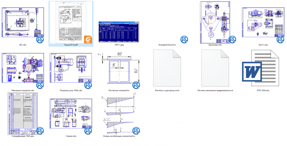 Чертежи в Компас: Общий вид (А1), Крюковая подвеска (А2), Механизм подъема (А1), Механизм поворота (А1), Опорные узлы (А2), Стрела (А1) и спецификация.