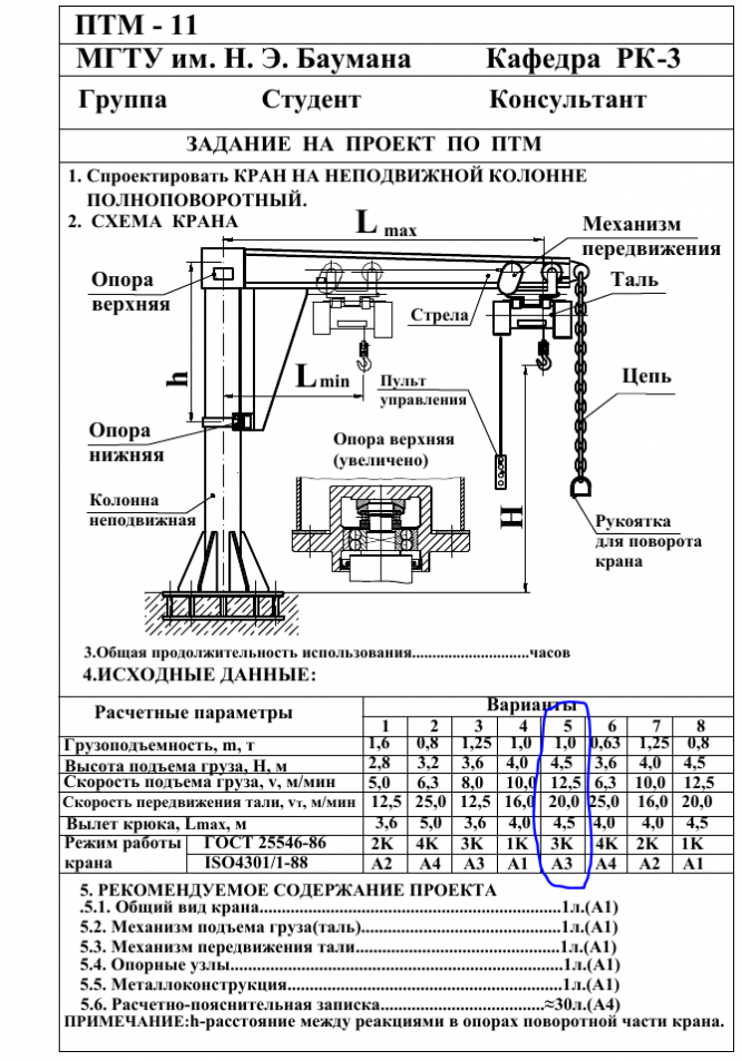 Для студентов МГТУ им. Н.Э.Баумана по предмету Подъёмно-транспортные машины (ПТМ)Задание 11_05 - Кран на неподвижной колонне полноповоротныйЗадание 11_05 - Кран на неподвижной колонне полноповоротный