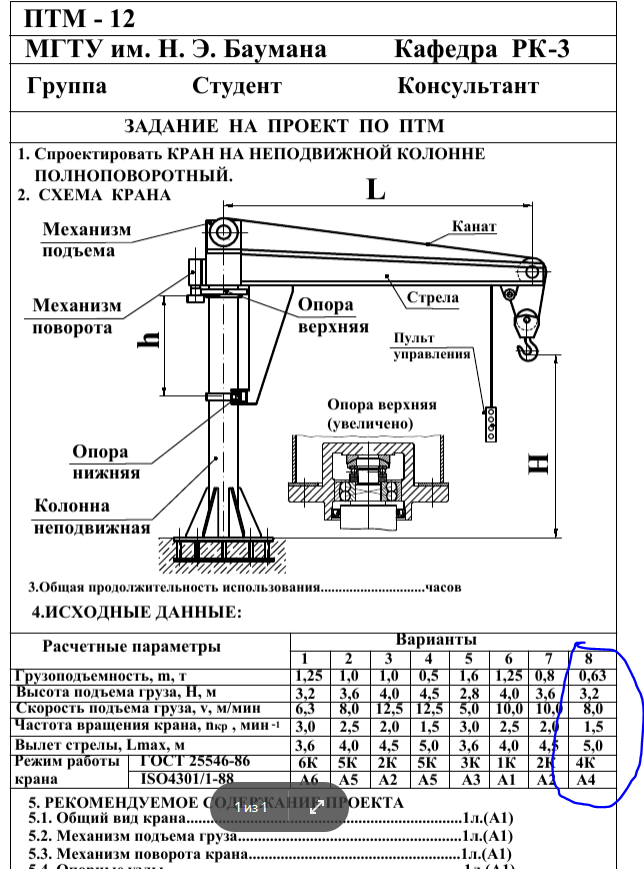 Курсовая работа 12: Задание 12-08 - Кран на неподвижной колонне полноповоротный вариант 8