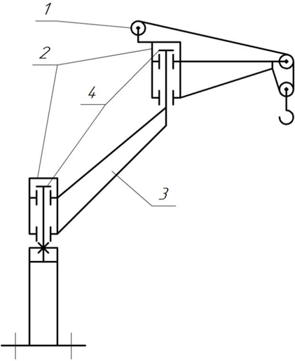 Рис.1 – Кран стреловой двухплечевой (КСД) (Поворотное устройство типа «колокол») 1 – механизм подъема – А1, ВО, 2 – поворотное устройство, 3 – стрела, 4 – подшипник упорный.