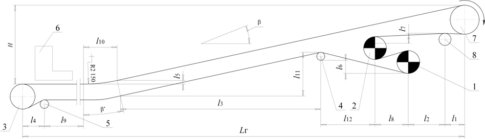 l7 = 1,8 м; l8 = 5,8 м; l9 = 6,9 м; l10 = 5,9 м; l11 = 7,7 м;l12 = 9,5 м; β = 21º 33´;