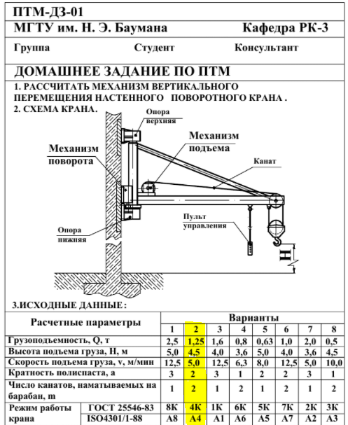 1. Рассчитать механизм вертикального перемещения настенного поворотного крана.