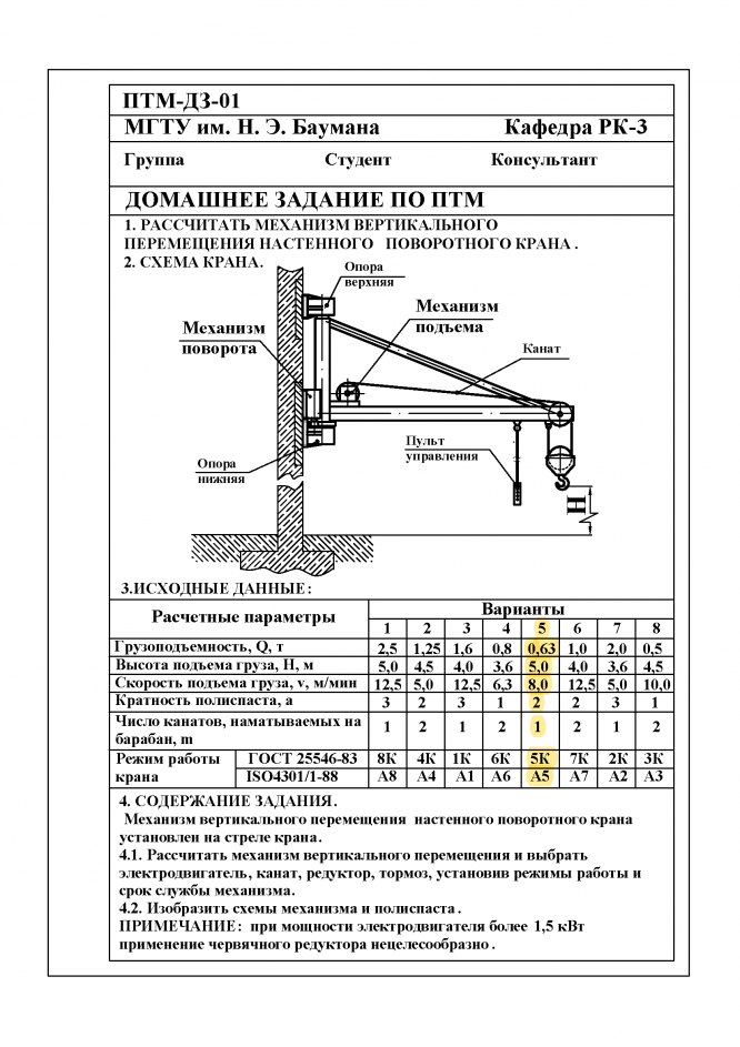 ДЗ 1: Расчёт механизма подъёмно-транспортной машины (ПТМ) вариант 5