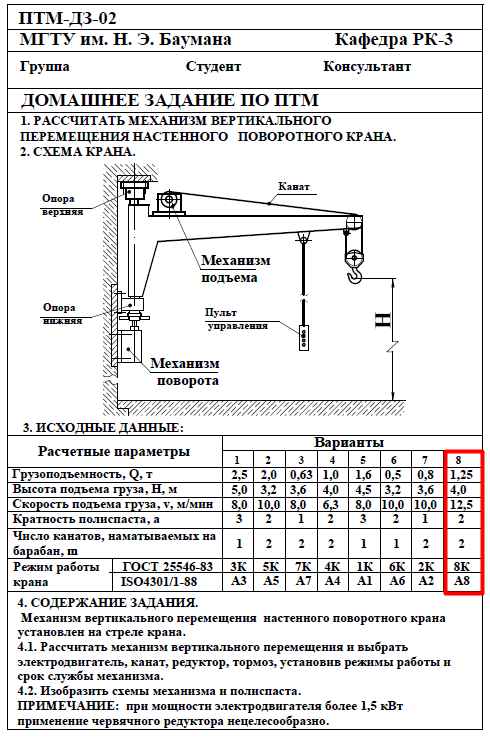 ДЗ 2: Расчёт механизма подъёмно-транспортной машины (ПТМ) вариант 8