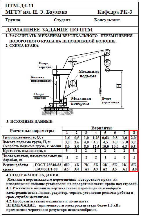 ДЗ 11: Расчёт механизма подъёмно-транспортной машины (ПТМ) вариант 8